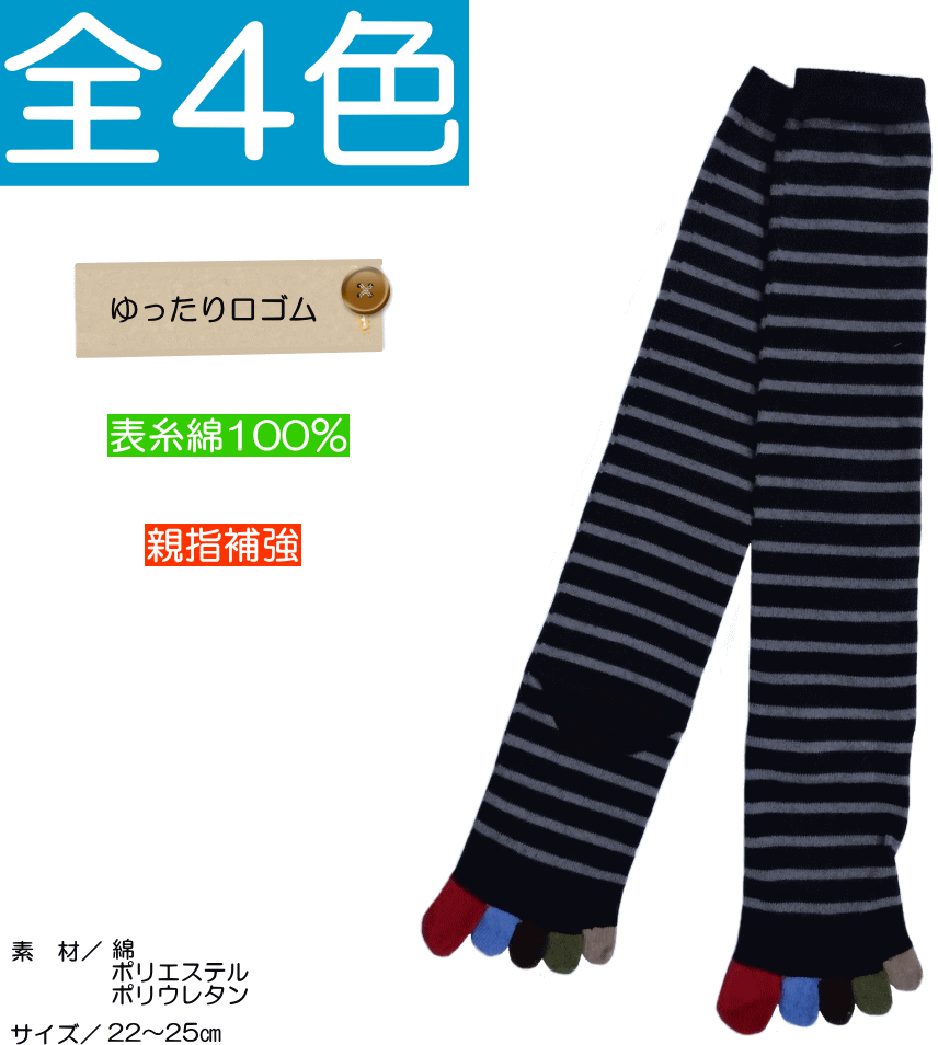 5本指ハイソックス レディース 指先マルチ細ボーダー ゆったり口ゴム 表糸綿100% 親指補強 /女性お洒落五本指靴下/[18a]【メール便可/20】