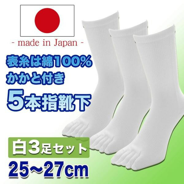 靴下 白 メンズ 綿100% 日本製のこだわり5本指ソックス 白3足セット かかと付き